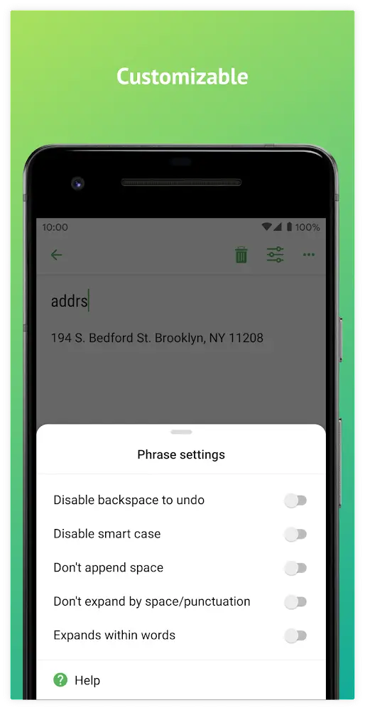 Texpand supports users to create shortcuts for fixed words and phrases. They will be entered right on the device and stored in memory to display suggestions when you perform text typing in any area. Therefore, the time spent on this activity is shortened and more convenient for users in the entire experience process. Besides, the system allows you to set up general settings to make your operation easier. When developing the app’s premium version, we determined limitations to be broken. Everything will become perfect for giving you the best experience space.