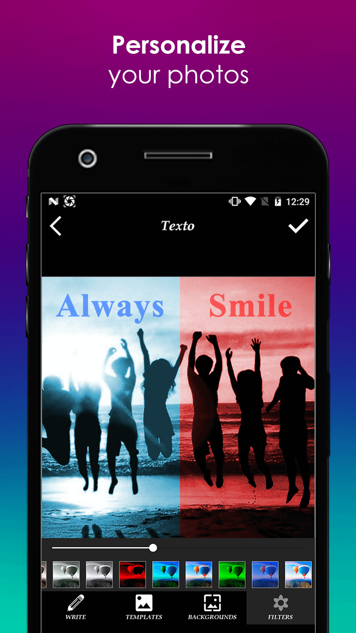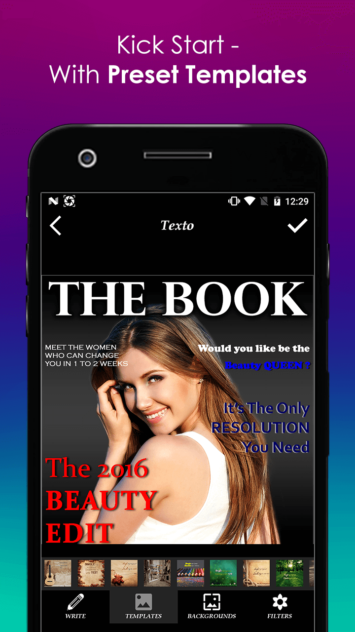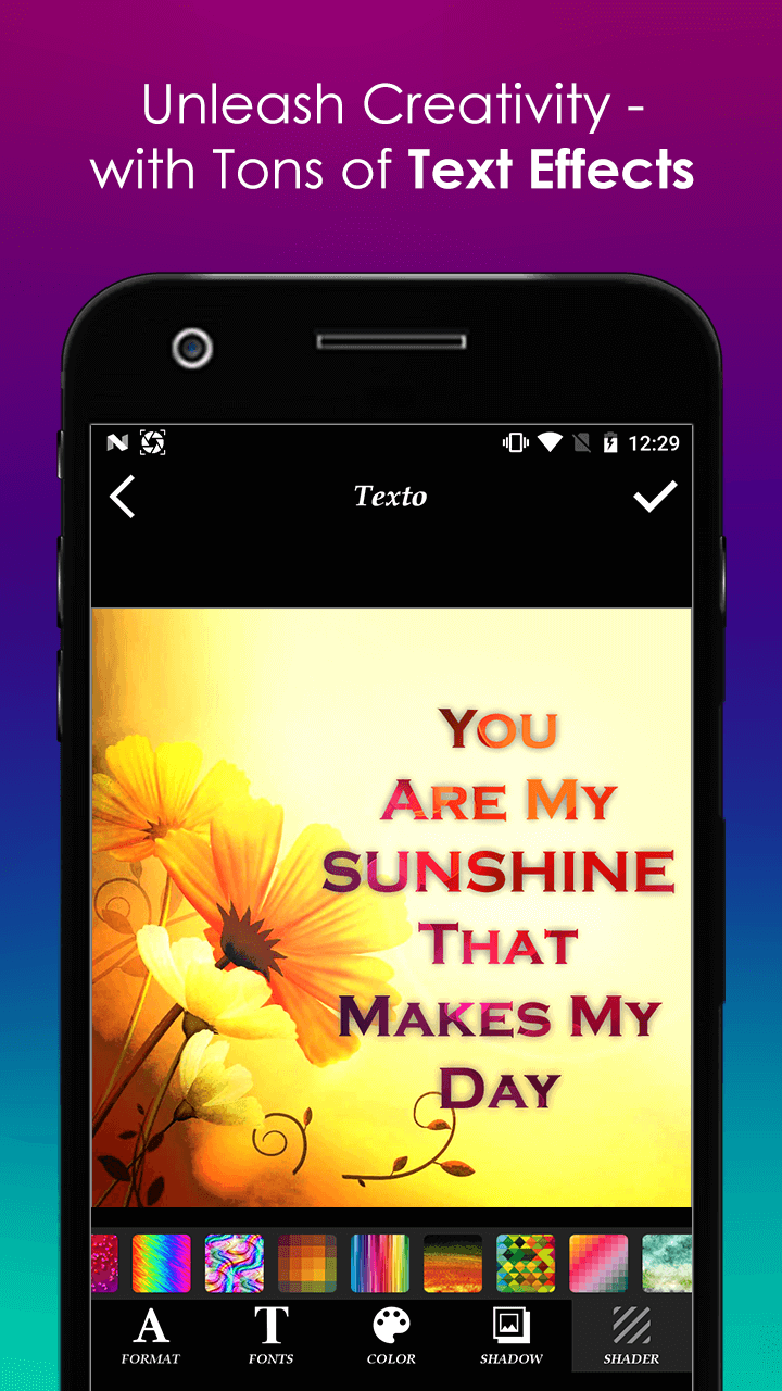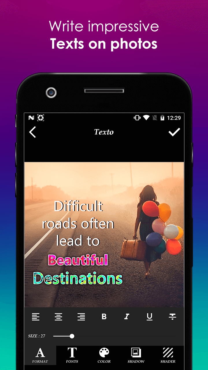 TextO Pro supports users to complete designs that combine text and images. From the provided tools, users can freely create their work. You can highlight the elements you want. Changes in the design will be made and saved by you. Tools adjust the text such as font, size, and color used. The system allows you to copy text and paste them to save time. However, the number of characters will be limited to ensure a balance between text and images. The application has many design templates. They are always available for you to reference and develop your ideas. Beautiful background patterns are also introduced. You can use pre-made templates or upload your favorite content.