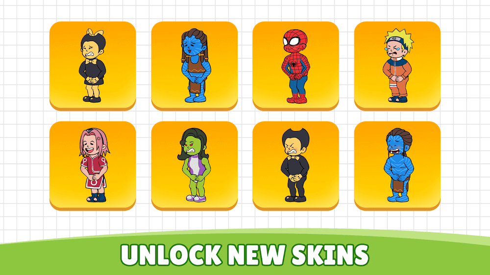 The main purpose of the game Toilet Rush is to provide players with exciting entertainment moments. Therefore, the game provides players with two extremely lovable Tom and Anna characters and is rendered in a chibi style. In addition, players can try to complete objectives to get unique skins for their characters, such as Poppy, Bendy, Blue, Ninja, and many more.