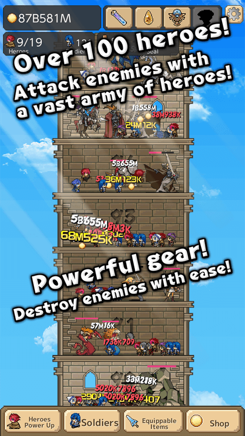 “Tower of Hero” emphasizes the strategic application of skills and abilities and the tapping and spawning of heroes. Four skills in the game grant momentary benefits for 30 seconds before going into cooldown. There are three corresponding equipable items for each skill that can improve its effect, extend its duration, or shorten its cooldown.