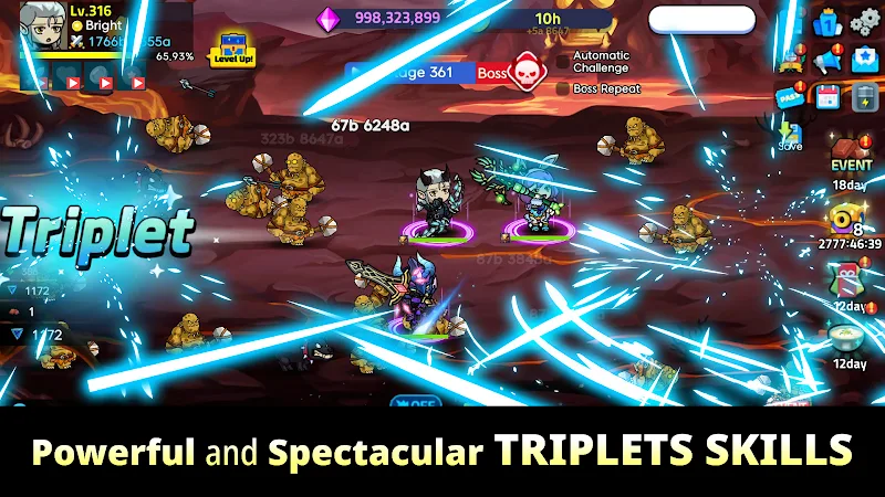At your command, your powered-up triplet heroes will constantly grind and grow even offline. They automatically traverse regions battling monsters for loot and experience. Their skills activate to dispatch scores of foes simultaneously. Simply check back to unlock new gear or heroes. This create a deeply satisfying incremental loop. And the hands-off approach means you can be productive while still growing mightier!