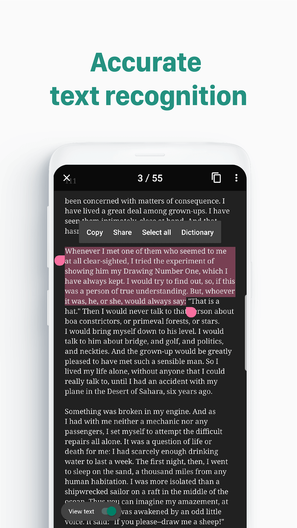 • Copy and Paste Text: Copying is extremely simple; users can select a piece of text or choose to copy the entire document with just a single touch. After copying, you can save the document to memory for document storage.