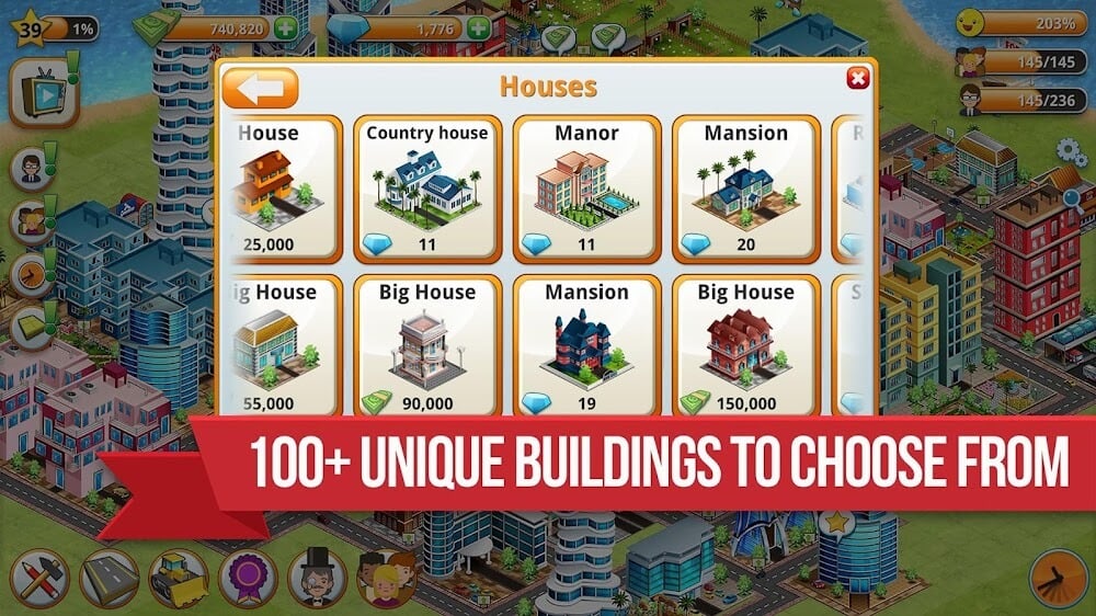 When you expand your empire, you can access 85 different types of structures; each can be combined to create a unique architectural style. From a small town to a large city with advanced architecture. Your commercial works will benefit you, even bringing billions of dollars daily. Players must master the skills to build the empire and make a commercial plan to succeed. In addition, improvement should be targeted, and regular modifications should be made to keep the maximum overall appearance.