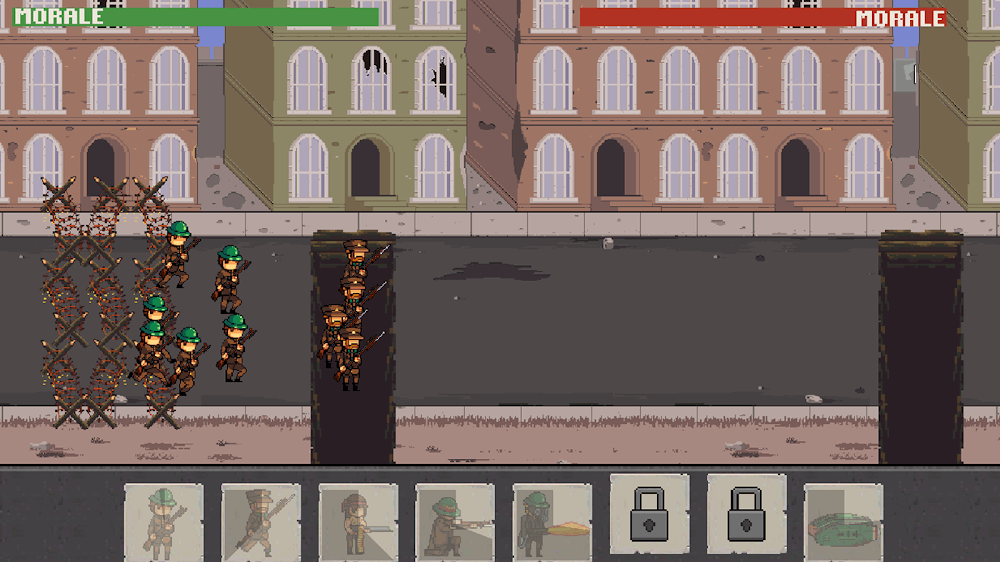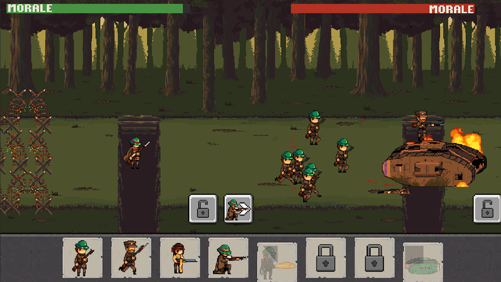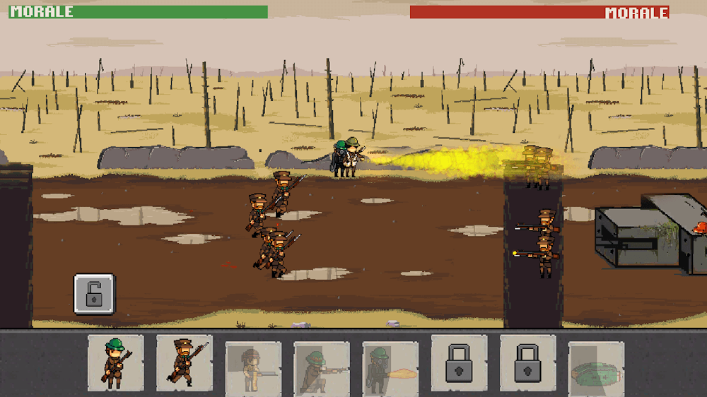 You need to command your troops to assault enemy trenches. Equip Troops and Air Units for attacking in the war against opponent player troops. Each soldier character consists of stats, including attributes like Damage, Range, Health, and Speed. Compare these stats of each war troop character and equip them with wise plans to form a strong army and, if needed, update the characters to increase their stats strength. But at all times, the update is not available particular soldiers can update in certain levels only. So to update any of your favorite characters, play well, reach that specific update-mentioned level, and enjoy the new features and capabilities of updated soldiers. These updated soldiers are helpful in the war and increase the winning probabilities with their strongest powerful stats. This War Troops 1917: Trench Warfare game is a pixel characterized and designed with traditional battlefield arenas.